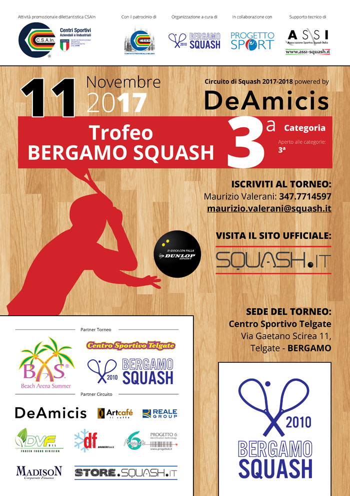 Sabato 11 novembre 2017 dalle 11.00 scenderanno in campo per contendersi il Trofeo Bergamo Squash, 16 atleti provenienti da svariate province.